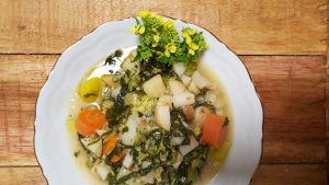 בגירסה הראשונה שהכנתי ממנו הוספתי עלי בר שליקטתי מהגינה, תפוחי אדמה (גם הם מהגינה), פלפל שחור, שמן זית וחריף מותסס. המרכיבים כולם בושלו יחד, הטעמים שהתקבלו היו נפלאים (אפילו תמי הסכימה לטעום, ואף ביקשה מנה נוספת).