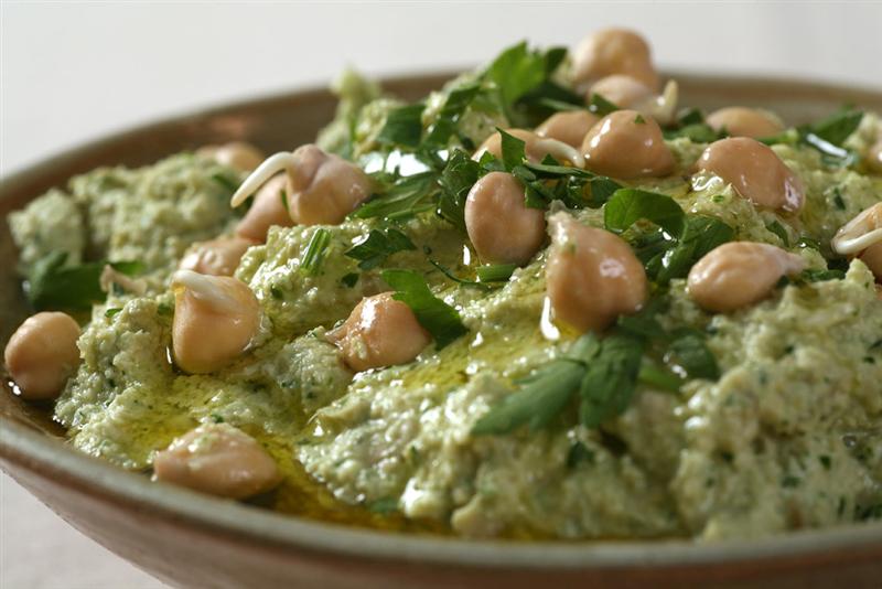 - Put the humus in small dishes, add some cooked chick-peas, and a mixture of the chopped greens. Pour a little olive oil and serve.